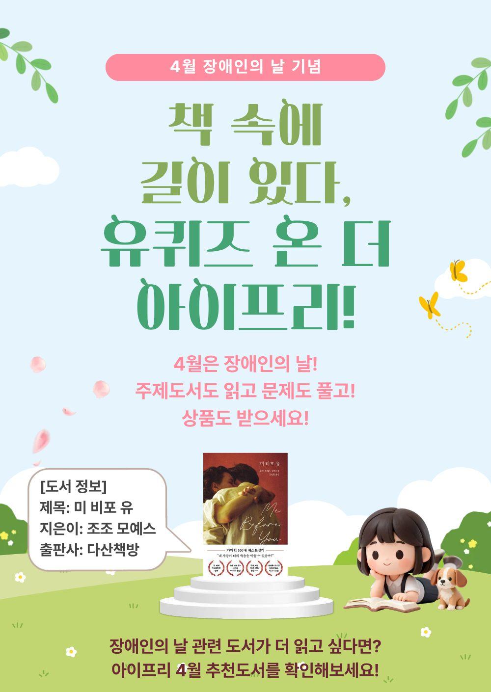 4월 추천도서 중 「미 비포 유」를 읽고, 독서퀴즈도 풀고, 선물도 받으세요!